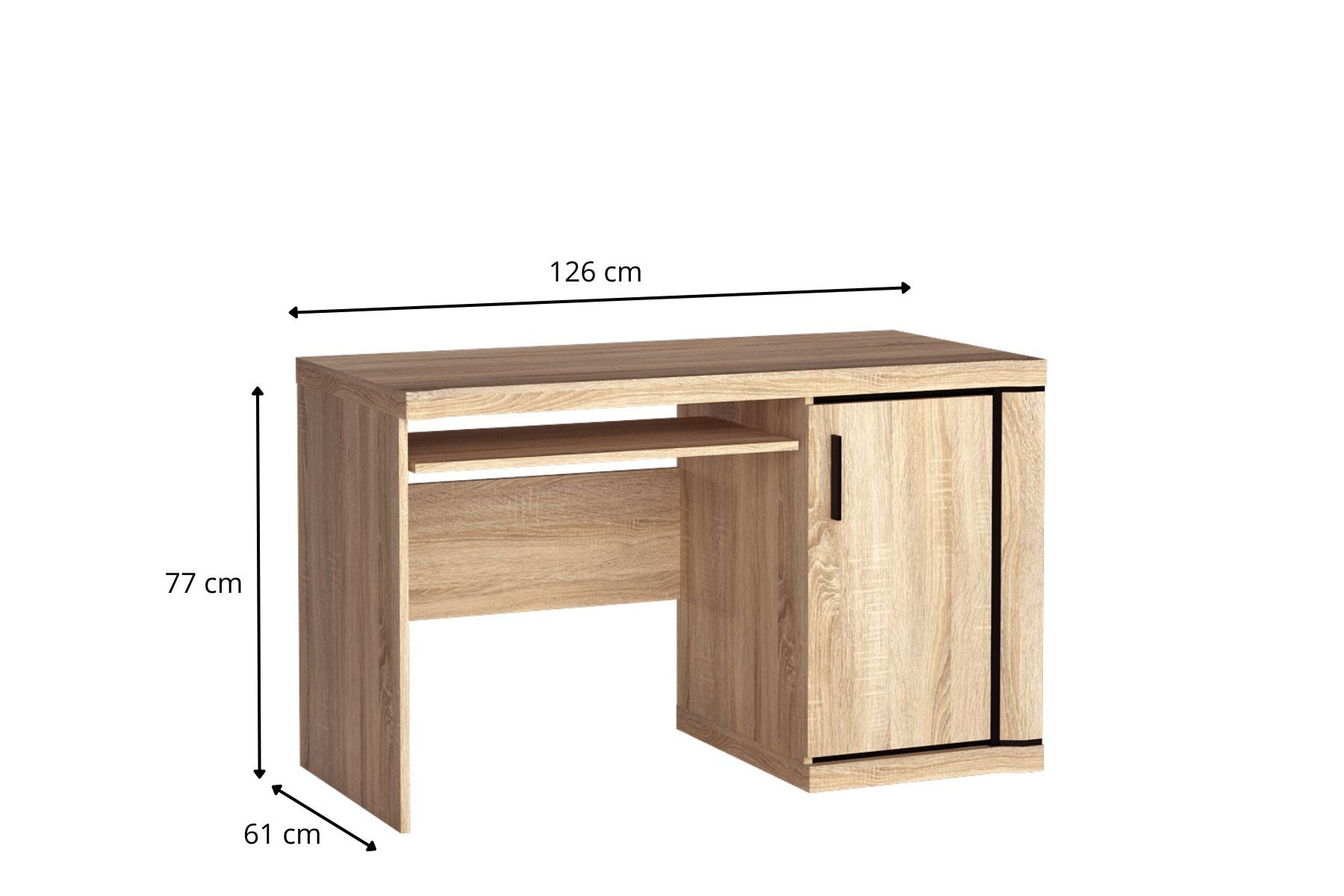 Piękne biurko, świetnie wpasuje się do pokoju młodzieżowego lub biura. Mebel zapewnia nam wysuwaną półkę na klawiaturę od komputera oraz szafkę z regałem. Dzięki temu praca zdalna oraz nauka będą prostsze. Biurko pozwala nam dobrze rozgospodarować nasze rzeczy, dokumenty w szafce, mając jednocześnie dużo miejsca do pracy i nauki. Swoim oryginalnym stylem, udekorowanymi czarnymi listwami ozdobnymi oraz metalowymi uchwytami, łatwo wpasuje się w każdą aranżację pomieszczenia. Dostępne w dwóch wybarwieniach. Stabilna budowa gwarantuje lata udanej pracy z biurkiem.