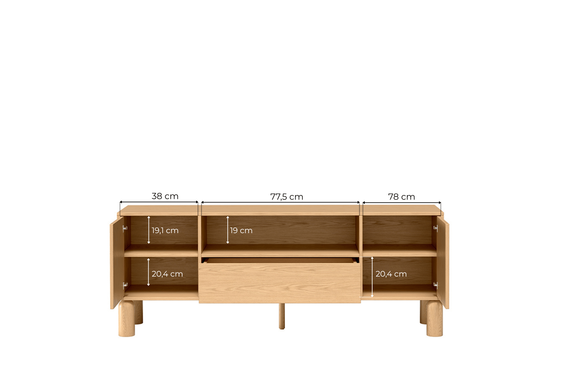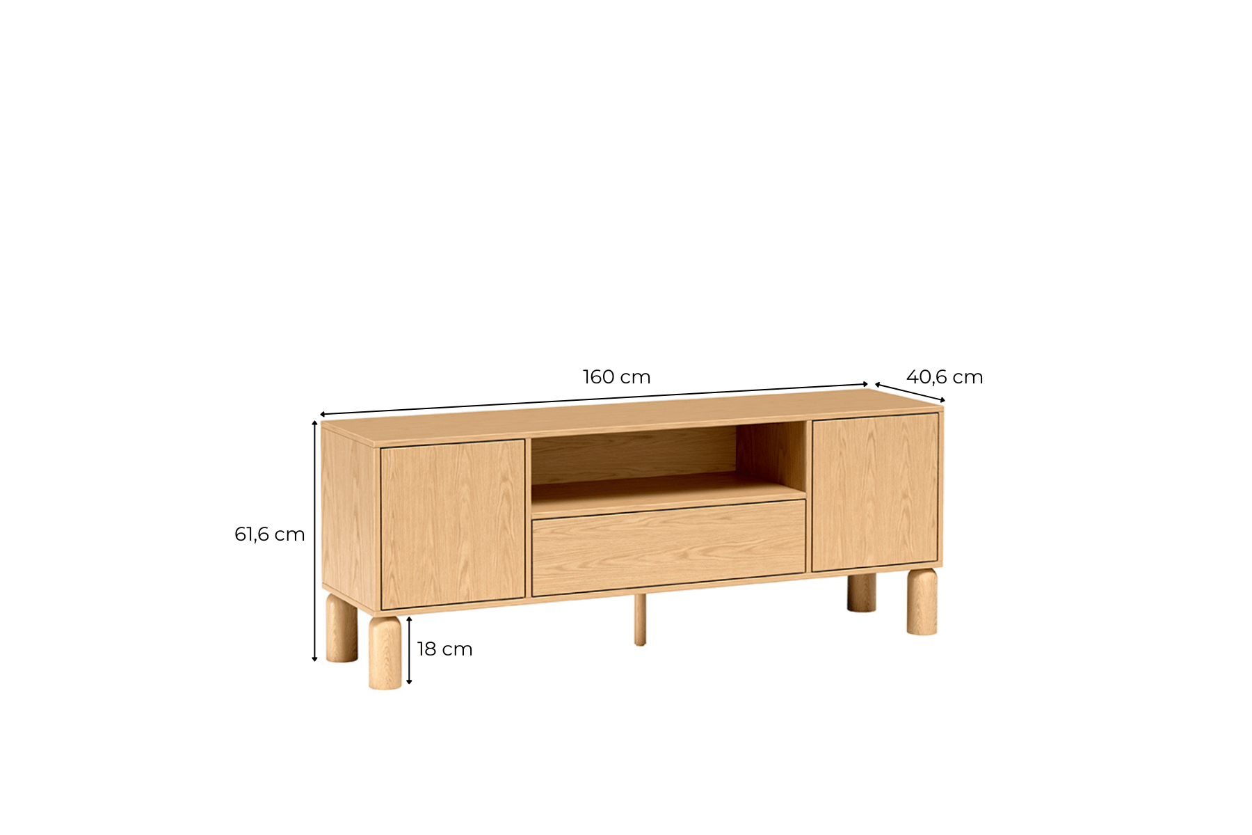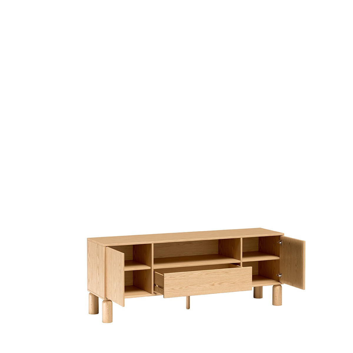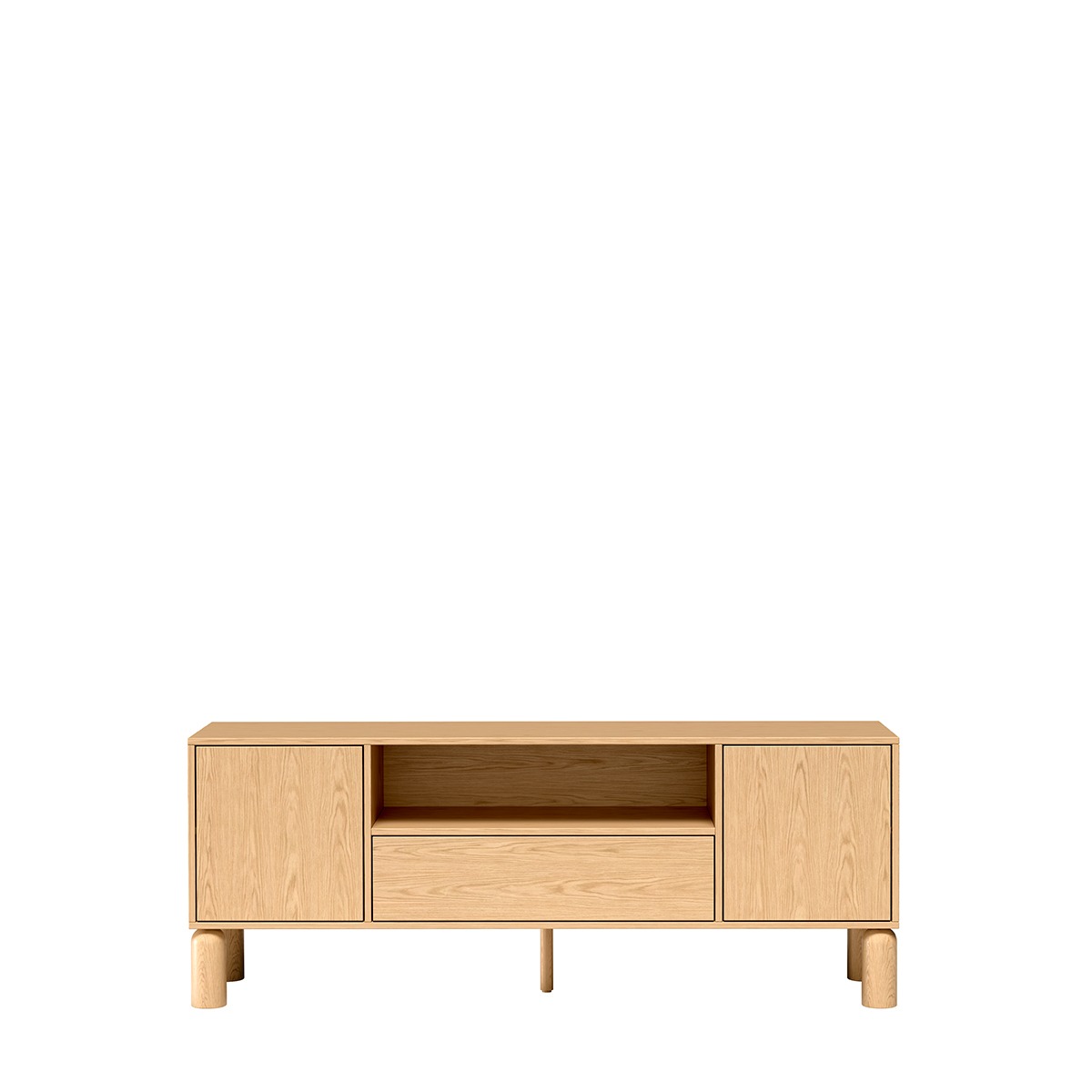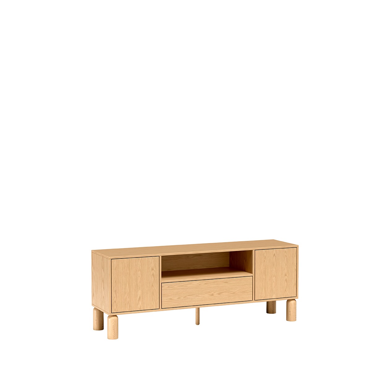 S-6 to szersza wersja szafki RTV, zaprojektowana z myślą o większych telewizorach i przestronniejszych salonach. Szerokość 160 cm zapewnia stabilną podstawę pod ekrany do 65-70 cali oraz mnóstwo miejsca na sprzęt multimedialny. Centralna otwarta wnęka pozwala na swobodne ustawienie soundbara, konsoli czy dekodera z doskonałą cyrkulacją powietrza, podczas gdy dwie boczne szafki z systemem push to open oferują dyskretne przechowywanie kabli, pilotów i akcesoriów. Fronty z naturalnego dębu bookmatch tworzą symetryczne, lustrzane wzory słojów, nadając meblowi unikalny charakter – nie ma dwóch identycznych szafek. Gładka powierzchnia bez uchwytów podkreśla minimalistyczną filozofię skandynawskiego designu. Wysokie 18-centymetrowe dębowe nogi unoszą mebel nad podłogą, optycznie powiększając przestrzeń i ułatwiając sprzątanie. Szeroki blat może również służyć jako powierzchnia do dekoracji.